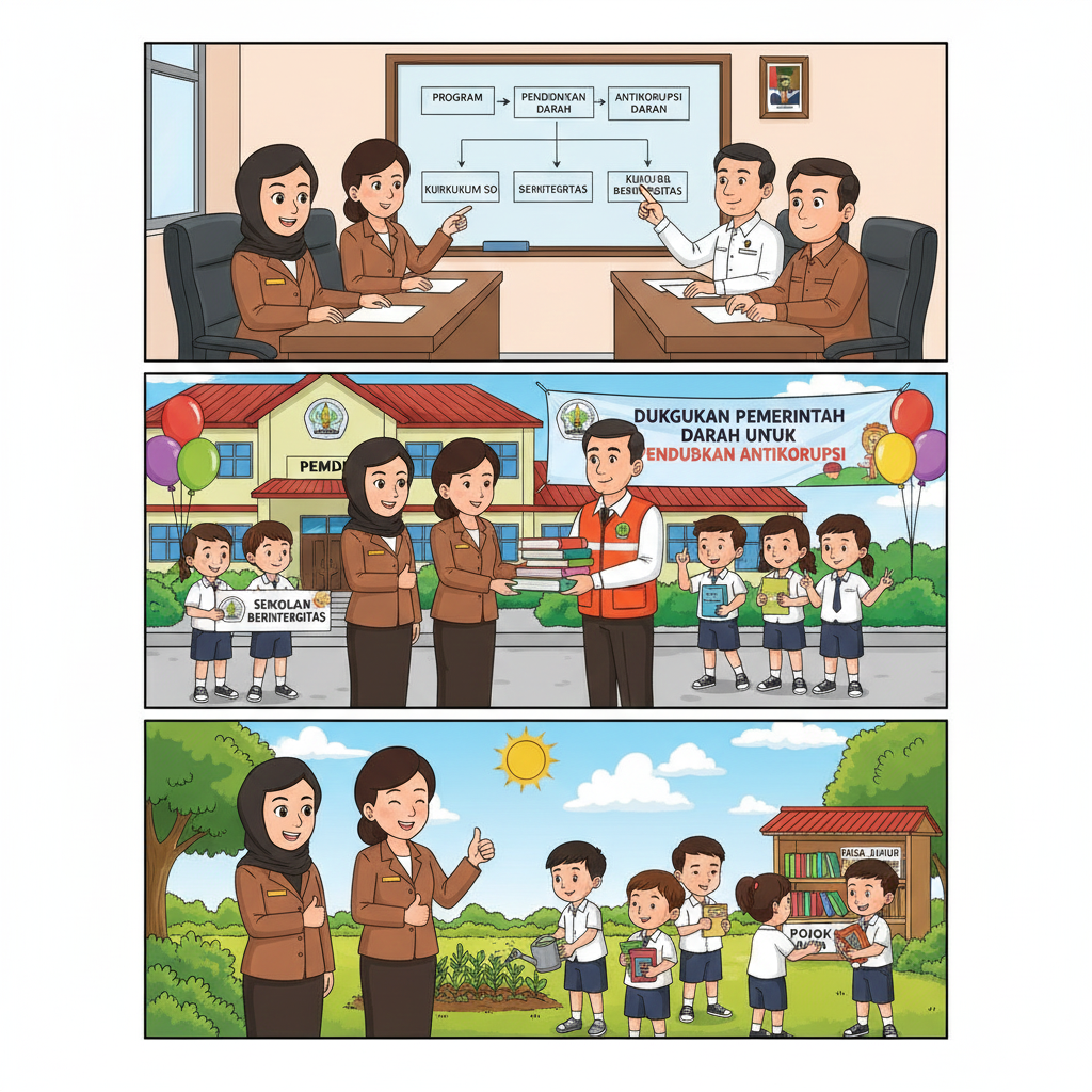 Dukungan pemerintah daerah dapat diwujudkan melalui kebijakan dan regulasi seperti Peraturan Daerah atau Peraturan Bupati/Walikota yang mewajibkan implementasi pendidikan antikorupsi di sekolah-sekolah. Alokasi anggaran khusus dalam APBD untuk program pendidikan antikorupsi memastikan ketersediaan sumber daya memadai. Dinas Pendidikan dapat mengembangkan kurikulum muatan lokal tentang antikorupsi yang disesuaikan dengan konteks daerah. Standar dan indikator pencapaian pendidikan antikorupsi dapat ditetapkan untuk memastikan implementasi yang berkualitas dan terukur.