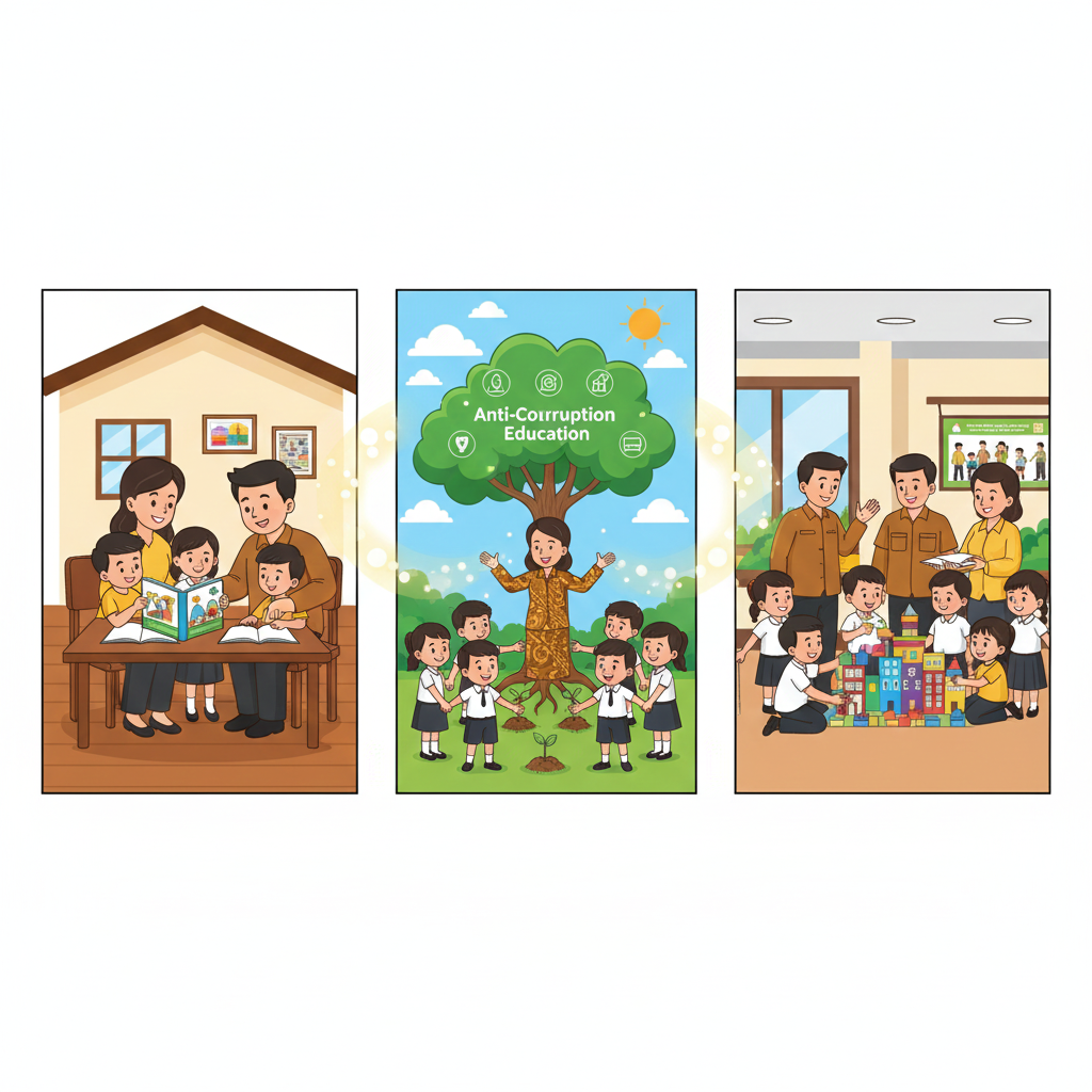 Sekolah berperan sebagai institusi formal yang memberikan pembelajaran terstruktur tentang nilai-nilai antikorupsi melalui kurikulum, pembiasaan, dan keteladanan guru. Keluarga berperan sebagai lingkungan pertama dan utama dalam pembentukan karakter anak, dimana orang tua menjadi role model utama dan memberikan penguatan nilai di rumah. Masyarakat berperan sebagai lingkungan sosial yang lebih luas dimana anak berinteraksi dan melihat praktik nilai-nilai dalam kehidupan nyata. Ketiga elemen ini harus memiliki visi dan praktik yang sejalan.